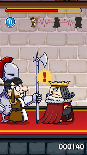 2、当角色靠近国王时,持续按住屏幕,待上方的蓄力条完全充满,角色便会挥刀刺向国王。不过,在蓄力的过程中,只要察觉到国王有回头的举动,手指就得立刻离开屏幕,避免被抓。
