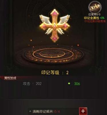 这个就是印记玩法的主界面了,可以看到当前我是2级印记,就有着202攻击力的提升了。下一级会有306点。