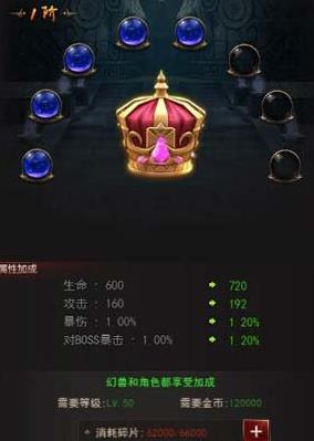 属性加成位于中间靠左的地方,能瞧见目前暴击伤害提升了1%,对BOSS暴击几率也提升了1%,我这进阶程度还很低。
