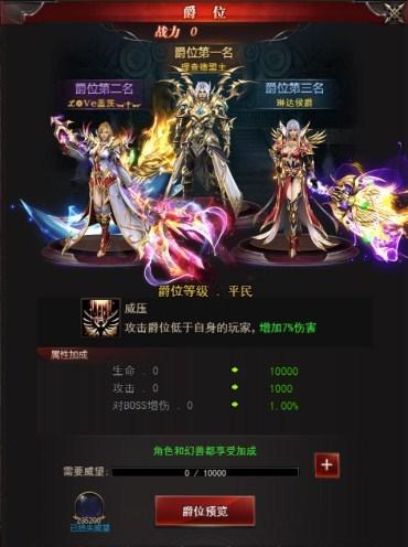爵位具备三种属性,即攻击、生命以及攻击 BOSS 时可获得的伤害加成。同时,爵位带有特殊被动技能,例如【威压】技能:在攻击爵位等级低于自己的玩家时,伤害会提升 7% 。系统每天 0 点会扣除威望,要是威望不够,爵位等级就会降低,相应属性也会被收回。此外,爵位等级排名前三的玩家,其信息会展示在每位玩家的爵位面板上,供大家一同欣赏。