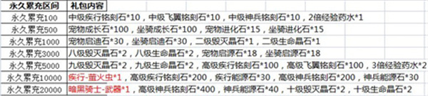 永久累充5000:九级毁灭晶石*2,九级生命晶石*2,高级疾行铭刻石*100,高级飞翼铭刻石*100,3倍经验药水*2