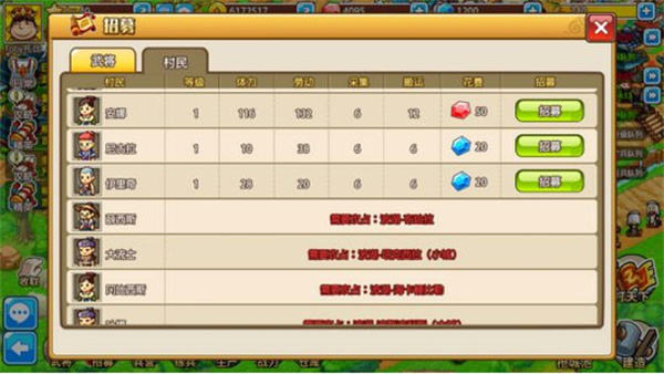 1、第一步,村民要借助村长大人们在主线关卡四处征战,成功击败对应关卡,解锁相应村民之后,方可在村庄左下角的【招募】→【村民】处展开招募。招募不同村民时,可选用蓝钻或者红钻。
