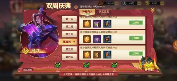 神秘商人任务是需要在沙盘演武中购买锻造石,总计需要购买30次后才可以得到橙色宝物箱子。这里是建议前三天都买满,后面再根据任务情况去节约元宝。因为现在沙盘挺难的,你很有可能会用忘记元宝购买锻造石,导致后面任务无法完成2、 巅峰达人