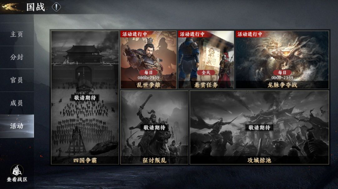 当前处于建国对战阶段,开放的玩法包含乱世争雄、悬赏任务以及龙脉争夺战。