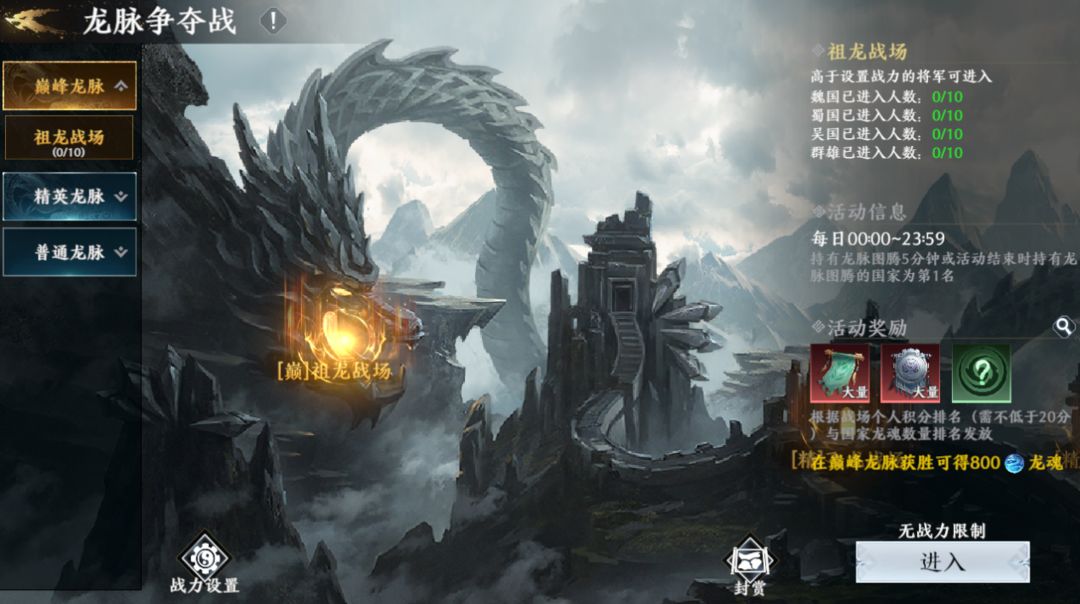 龙脉争夺战:玩家可在不同类型龙脉战场上发起战斗,并争夺龙脉图腾,持有龙脉图腾五分钟或活动结束时持有龙脉图腾的国家为第一名,第2~4名按照战场中本国所有个人积分之和进行排名,最终按照排名发放个人奖励。