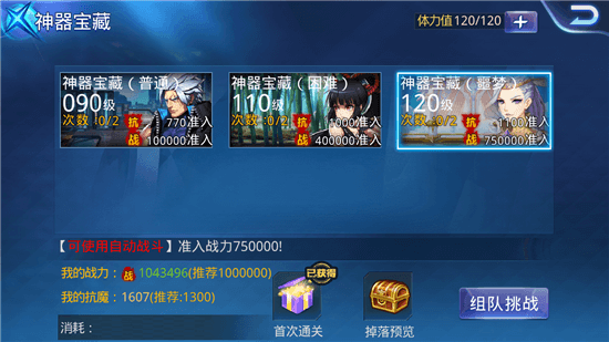 神器宝藏设有三个关卡,分别是神器宝藏(普通)、神器宝藏(困难)以及神器宝藏(噩梦)。玩家每日最多通关2次。各关卡对玩家的战力与抗魔值要求各异。以难度最高的神器宝藏(噩梦)为例。