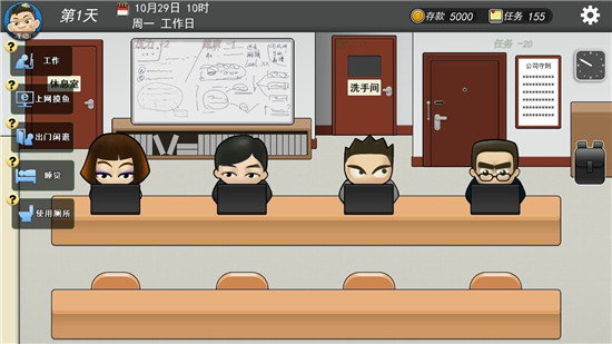 如下图所示,当老板出现在这一行,或者就在你身边时,你可以选择工作,或者去上厕所。尽量别选择上网摸鱼,也不要出去闲逛,因为这样被发现的可能性会大幅增加。一旦被发现,老板对你的信任就会降低。