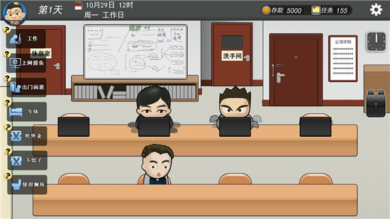 闲逛。到了12点了,尽量不要选择吃外卖,晚上也是吃外卖会花钱,但是有时候运气好会有红包,可以选择午休(中下午不吃外卖不会有影响)老板在办公室的时候你可以点一下,会出现有谈心或者是其他的选择,有谈心就点击进去,和他谈心会增加信任感。到了17点的时候选择加班会增加信任感,老规矩行事,别回家那么会花几十块钱吃顿好的,22点在回家是最省钱的时间。上班第三天会出现好图下的剧情,挨个问一遍就行了。