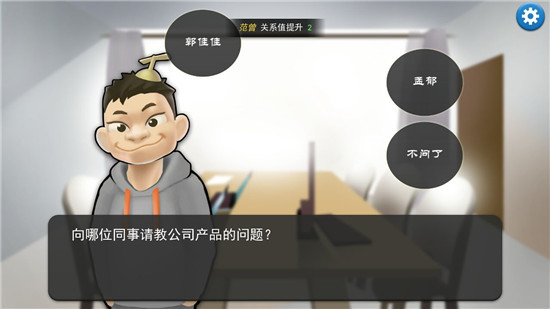 初次面试时,老板会向你提问,按我所说的回答就能顺利通过。具体回答选项如下:其一,选择添油加醋;其二,选我从未失败过;其三,选人性化公司;其四,选期待。 等开始上班,老板会逐一为你介绍公司的员工。这时统一选择“很高兴认识你”,这么做最为稳妥,对新手而言,这样能让每位员工对你增加5点好感度。要是面对范曾,选择“大佬请带我飞”,会增加10点好感度。总之,千万别选最差的那个选项,“很高兴认识你”属于中等选项,能增加5点好感度。介绍完后就直接进入工作环节了。