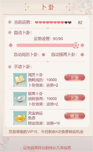 通过消耗阅历和银两都能增加一定的运势,使用元宝可以转运获得大量的运势,提高VIP等级可以提高每天的免费转运次数。