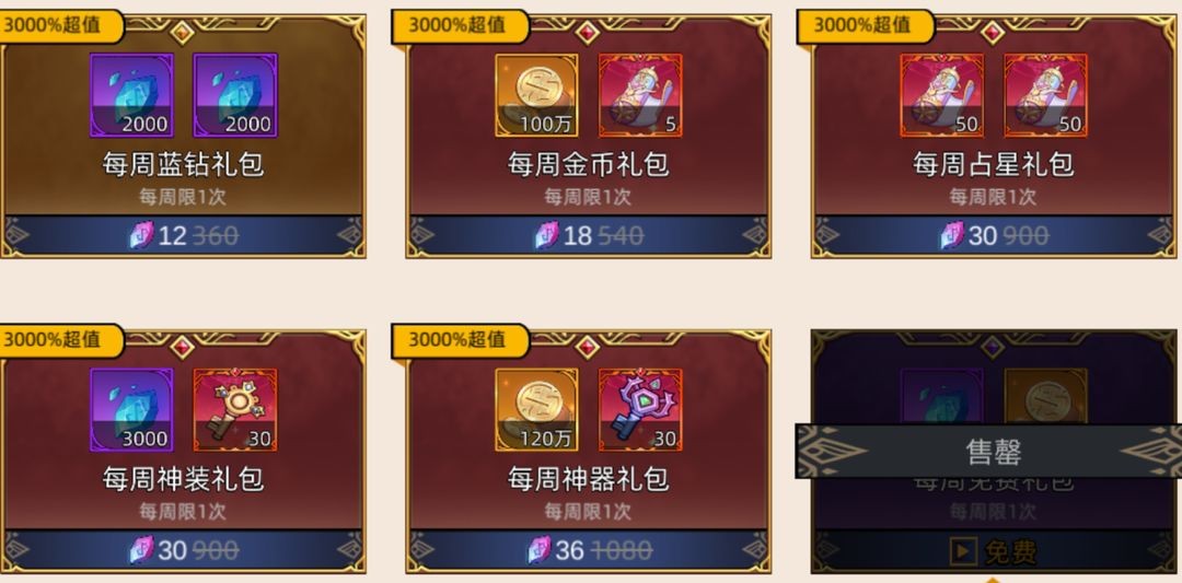 其他的一些像连续充值、限时礼包之类的,个人建议只去换取蓝钻无法购买的道具。因为只要你买了那些助力之类的,蓝钻就都还算比较充裕。当然,重氪的话随意~