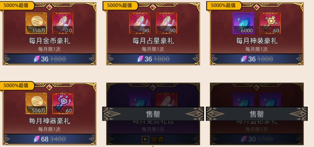 5、每日周月礼包(只推荐月礼包,其他不推荐)