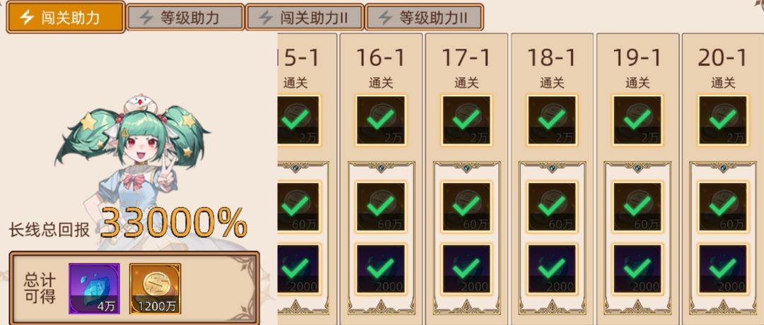 36元的闯关助力(4万钻 + 1200万金币,助力你抽卡、强化无忧。关卡难度也都比较低,很快就可以拿满)