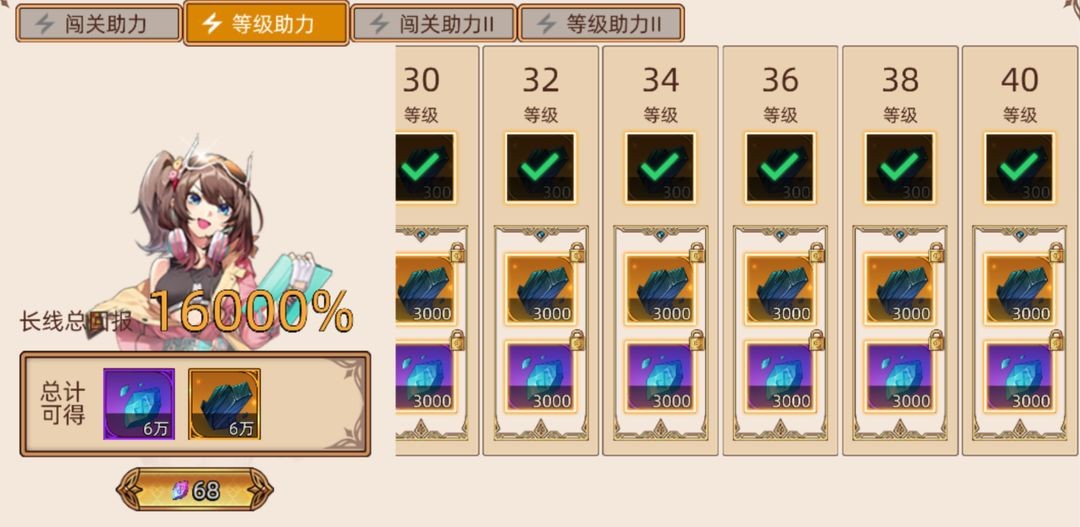 2期的闯关助力,也非常推荐购买,68元 = 6万钻石 + 4000万金币 = 600抽 + 4000万金币,金币基本能培养 4 个满星角色了。