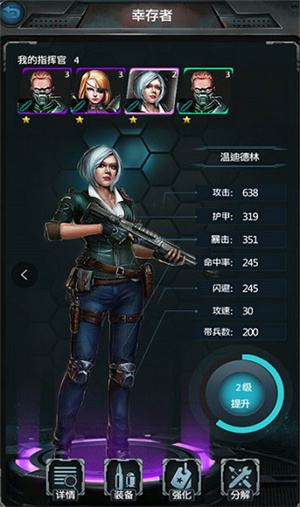 在目前游戏中,幸存者培养是战力提升最为直接并且最为有效的方法,而相对来说,提升幸存者装备和等级来增加携带士兵数量在游戏之中是最为影响战斗力的因素,因此我们游戏中要尽可能提升自己的战力水平,最为直接的办法莫过于不停进行PVE刷图收集装备合成材料,每装备一件装备都会获得额外属性,装备品质越高,属性提升越大,不过在提升幸存者战斗力的时候一定要注意不要过分倾向于一艘幸存者的培养,最好分类型培养,如果其它幸存者战斗力上不来,战斗中会很容易出现1V3的情况,得不偿失。