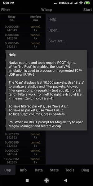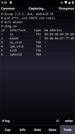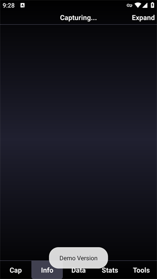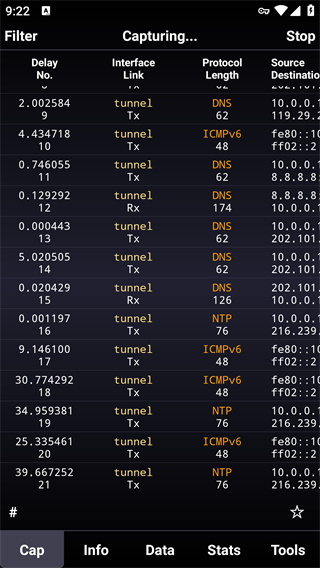 2、点击Info,可以实时监控网络连接状态,以及发送和接收的数据包情况