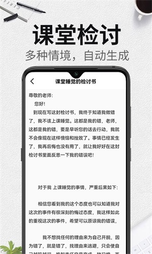 这款软件一经推出,就给大家提供了诸多帮助。当你要写检讨书时,无需再费尽心思去琢磨。它能为你提供丰富的检讨文本内容,有用的部分保留,没用的内容让其删除,之后再融入一些你个人的想法就可以了。