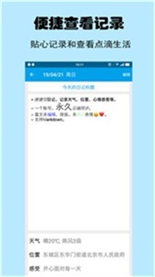 映天日记是一款极为实用的生活记事软件。软件的整体设计简约明朗,各项功能便捷易用,让你随时随地都能轻松打开使用。它能贴心地记录下你日常生活里的每一个细微之处,你可以毫无压力地记录下想要留存的内容,方便日后随时翻阅查看,为你留下一段特别美好的回忆。