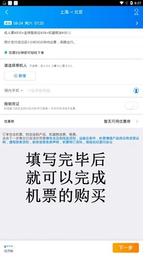 然后就是机票的购买界面了,我们填写完正确的信息后点击购买即可。
