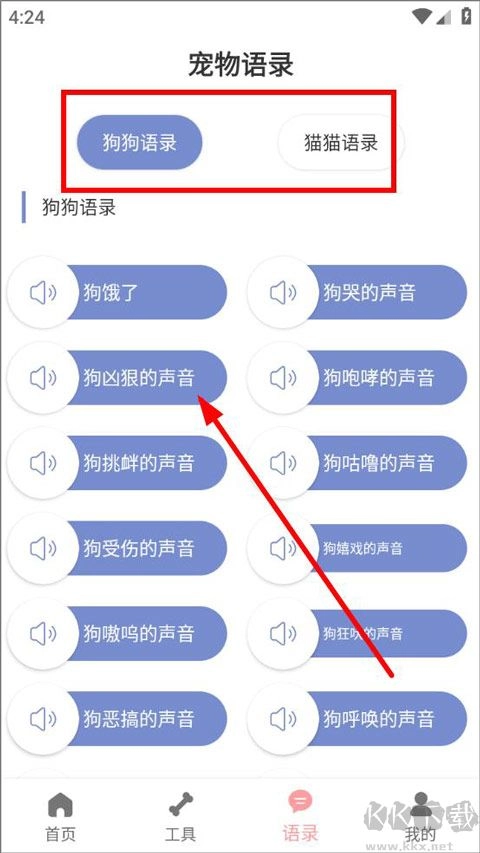 4、进入语录页面,就能播放狗狗和猫咪处于不同场景与状态(像饥饿、啼哭、咆哮、受伤等情况)时的语录内容。