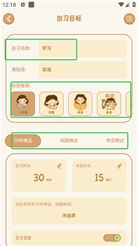 2、选择你喜欢的三种自习模式:计时模式、校园模式和禅定模式,灵活自定义学习时长及休息时间,给自己输入激励语,并打上标签,开始你的学习之旅吧。
