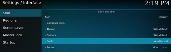 8、如果是不熟悉的皮肤,找到语言设置,Chinese改为English。Skin设为Estuary,Fonts设为Arial,Regional - Language设为Chinese(Simple)。