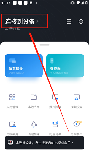 1、首次进入软件,投屏前需先建立电视与手机设备的连接,在下图所示位置点击“连接到设备”,添加个人的电视设备。