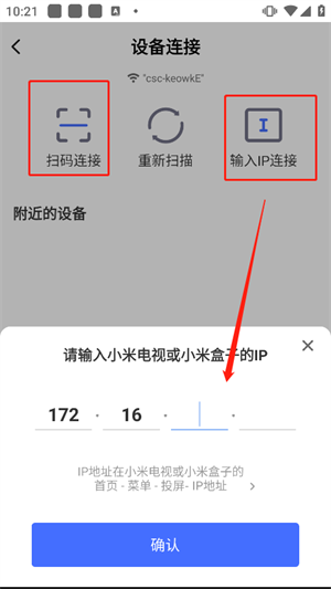 3、除了上述自动连接的方式外,我们还可以通过扫码或输入电视ip的方式进行链接