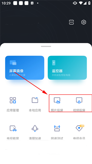 4、与电视连接成功后,返回软件主页点击其中的照片或视频投屏即可将手机上的画面投屏至电视机上