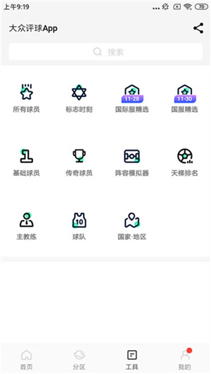 1、第一步,打开大众评球app,找到并点击“工具”选项,接着点击“所有球员”。