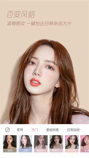 1、该软件在拍摄按钮上方设有热门妆容推荐,能够一键直接上妆,而且妆效都相当不错。
