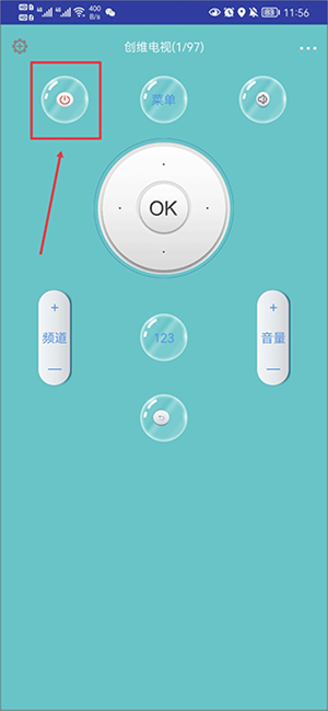 3、然后将手机对准电器设备,并按下左上角电源键进行适配,待设备响应后即可使用手机操控设备