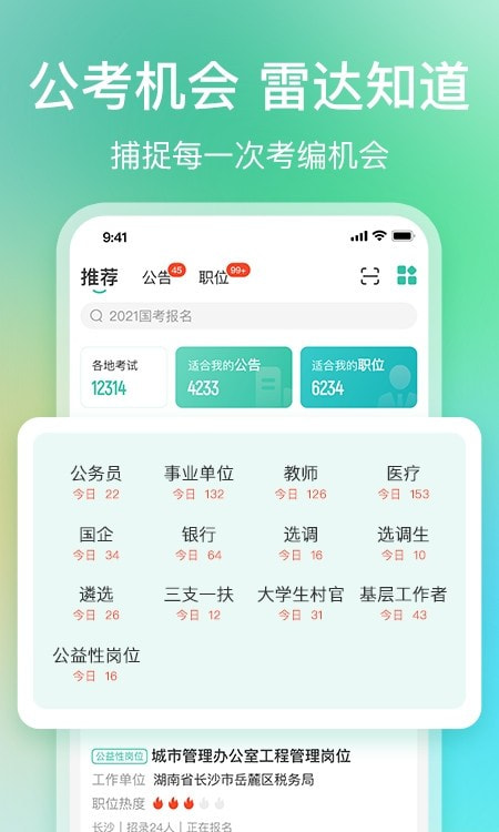 公考雷达权威发布全国公职类(涵盖公务员、事业单位、教师、医疗、三支一扶、村官、遴选、选调、招警等)报考公告及职位信息,依据简历信息能快速匹配到最适宜的优质职位。你是否知晓,除了一年一度的省考、国考,实际上每天都有各类公职类考试。